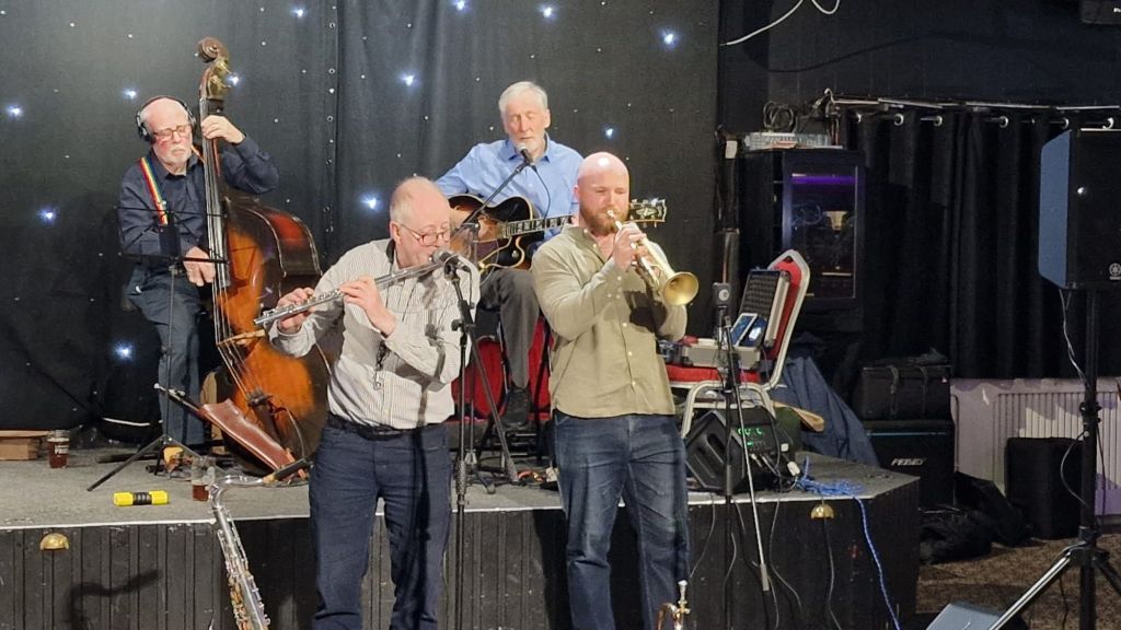 What a great band this week, audience a bit light due to half-term duties, me included but some fabulous sounds from this super quartet featuring Chris Flegg, leader, guitar, vocals, Peter Hughes on double bass, Jack Jennings on trumpet/flugelhorn and Nick Payne on sax/flute. A good night had by all and another visit from them later in the year to look forward to. Videos will be posted on FB and the WhatsApp Group